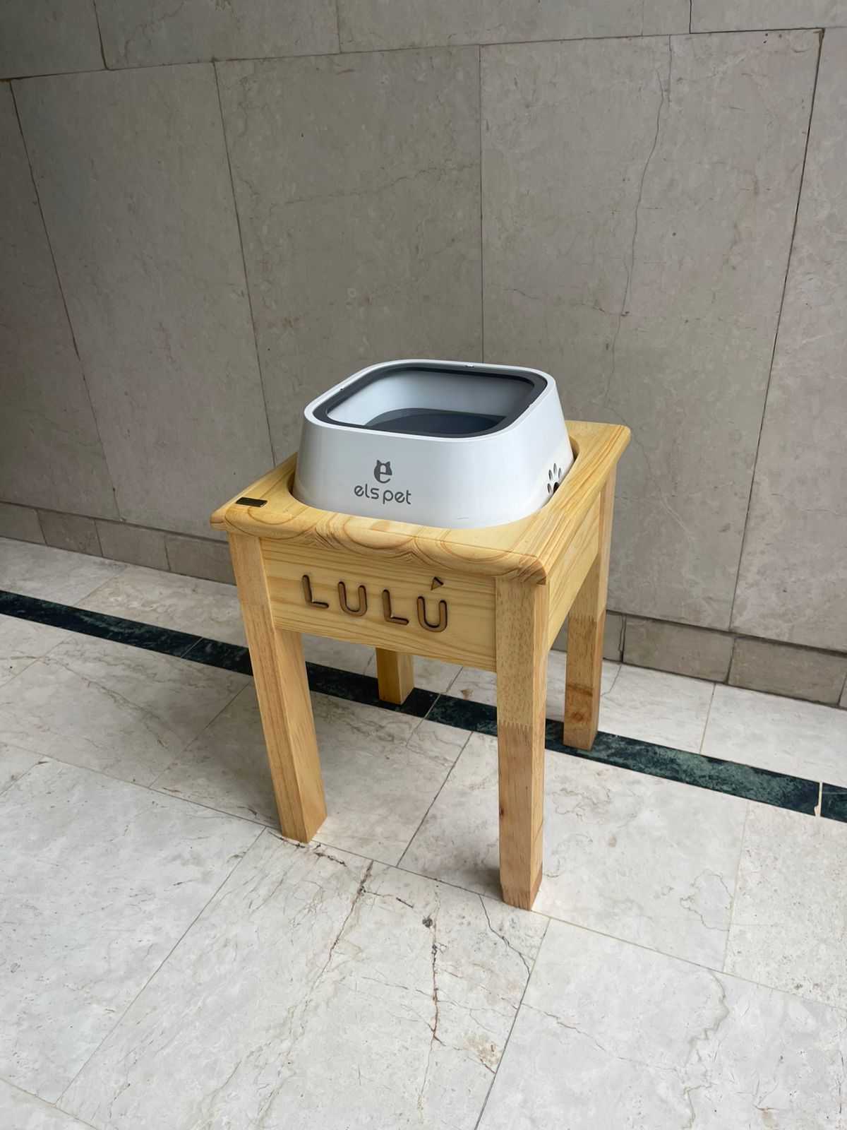 Comedero individual con bebedero flotante incluido (LAS MEDIDAS DEL BEBEDERO ESTAN EN LAS IMAGENES ADJUNTAS); la base esta elaborada en pino canadiense con una laca protectora para su conservación.