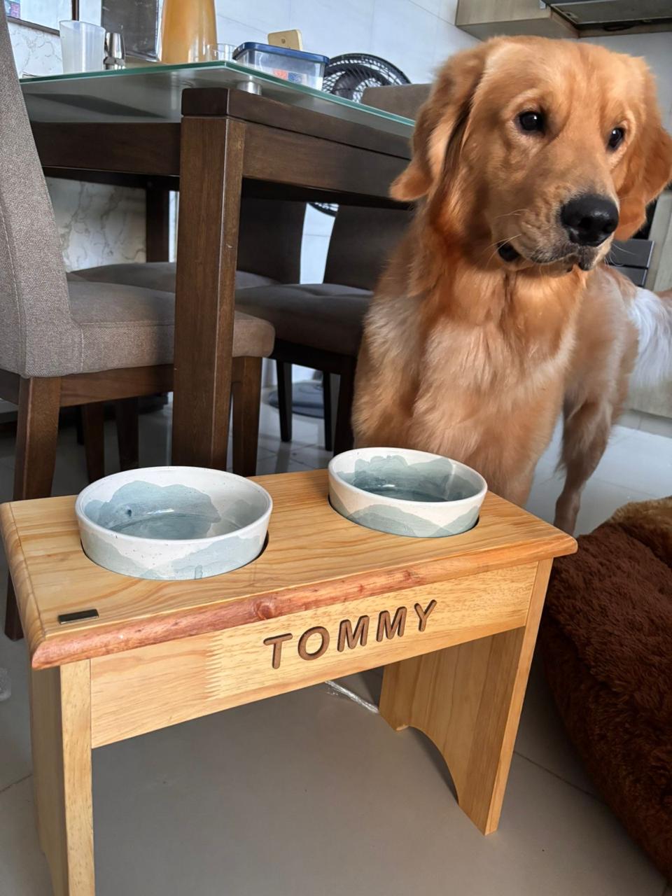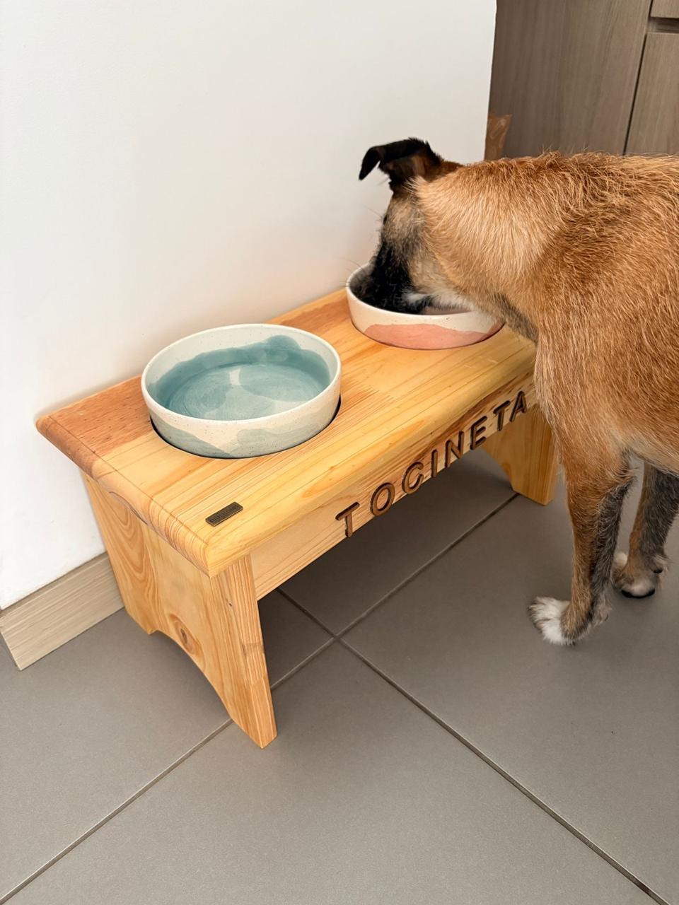 Elaborado en pino canadiense, sus dos bowls artesanales son en cerámicas, su alto es de 5 cm y diámetro de 16 cm. Sobresalen 3 cm de su base.