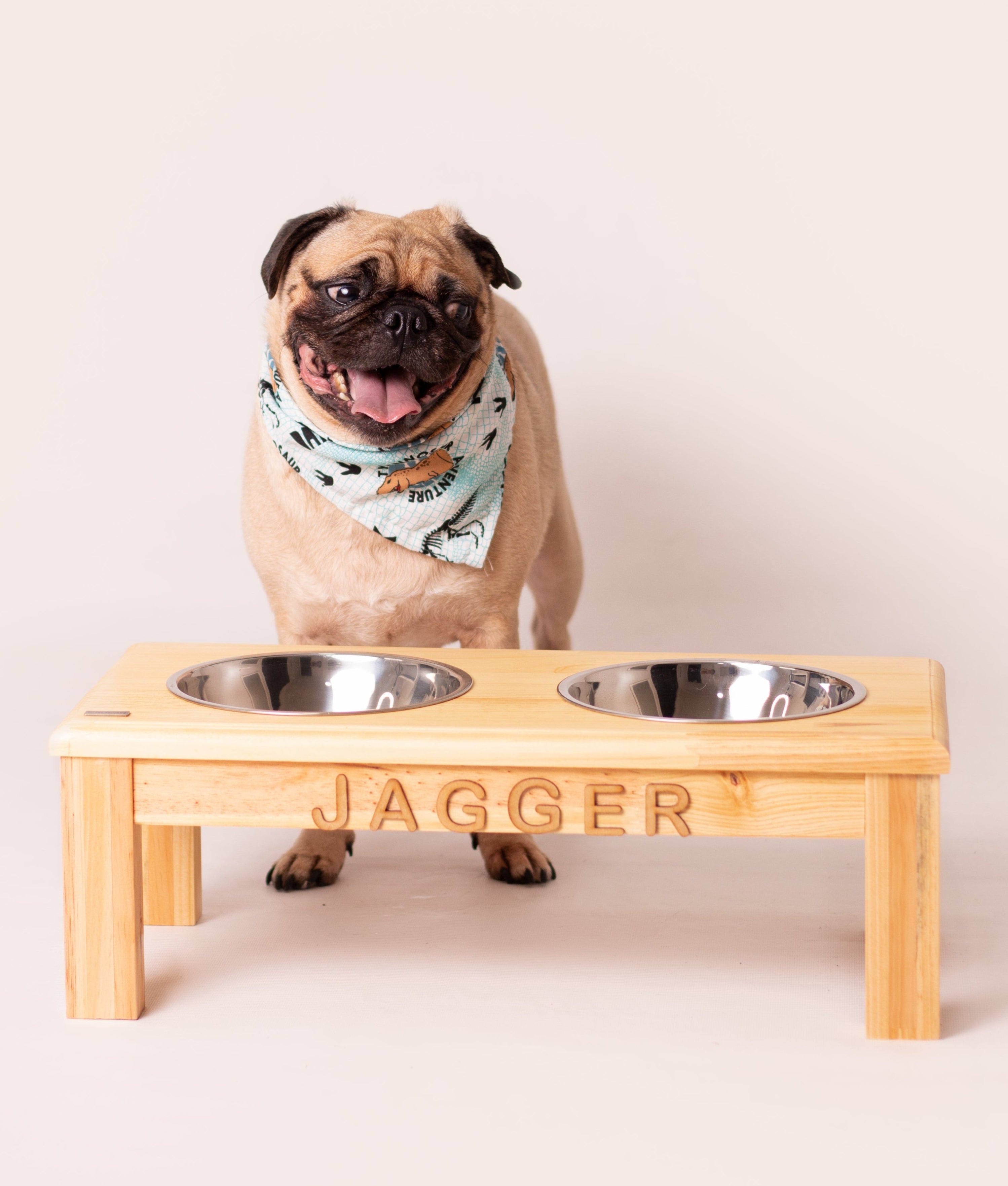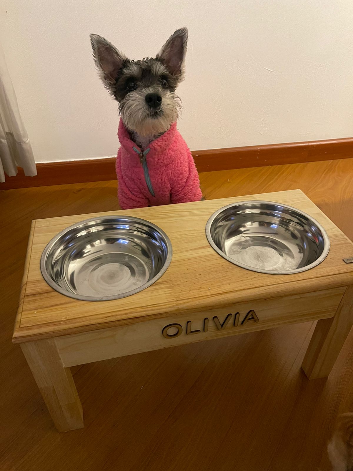 Comedero alto elaborado en pino canadiense y platos en acero inoxidable.