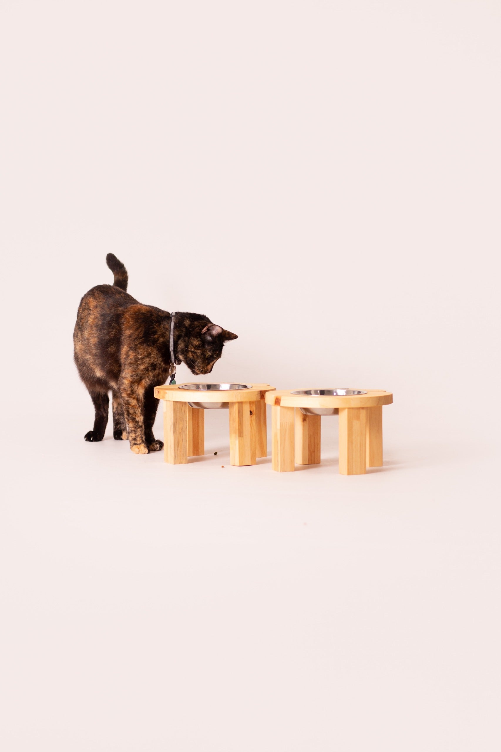 Comedero elevado artesanal para gatos, fabricado en madera de pino canadiense de excelente calidad, resistente y con un diseño cálido y funcional.